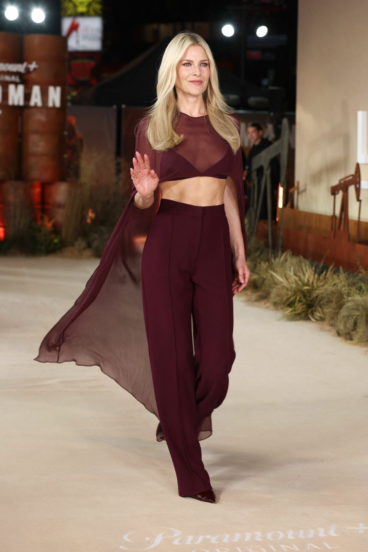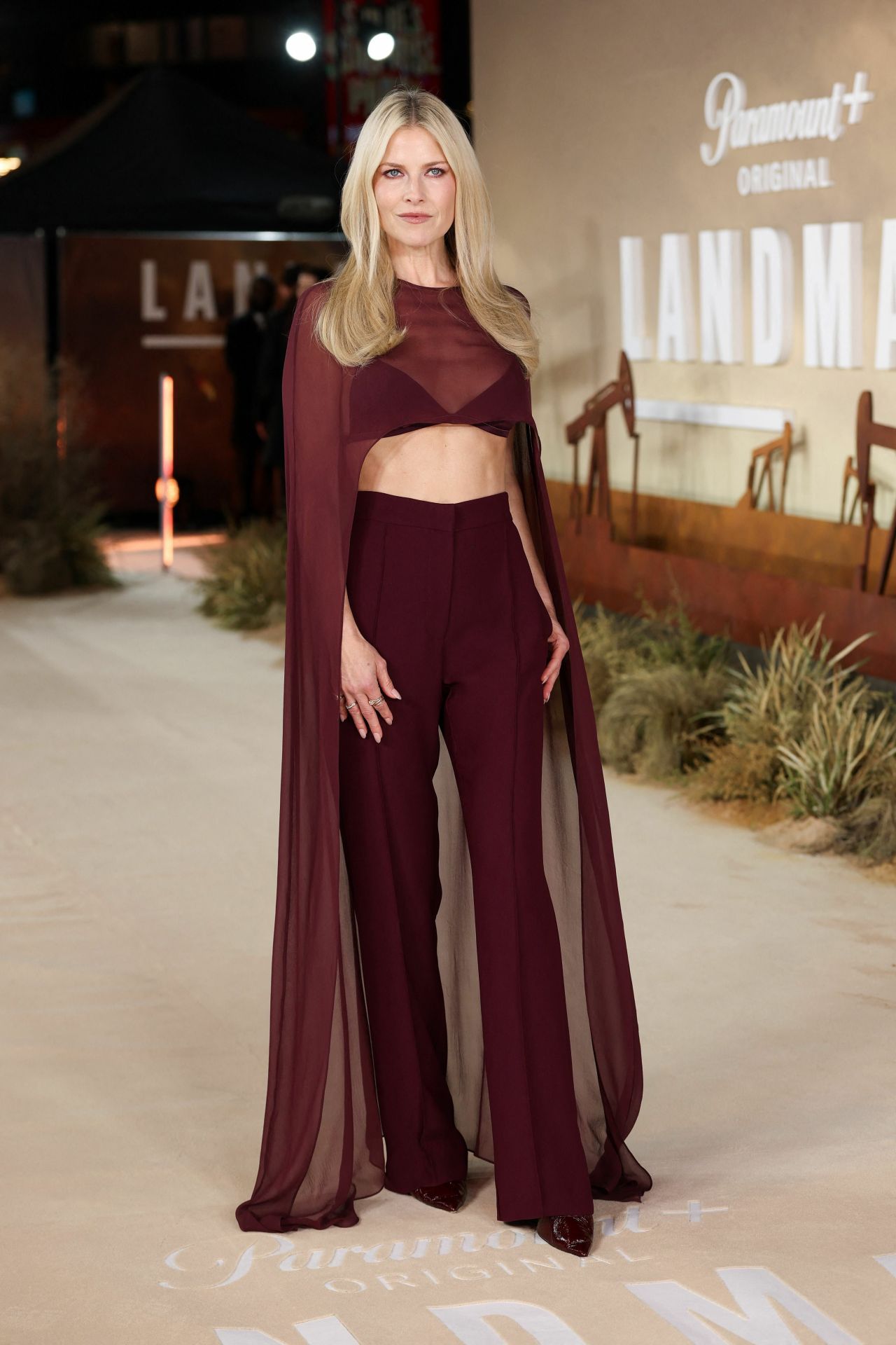 Ali Larter turned heads at the “Landman” UK premiere, sporting a daring and unconventional outfit that left little to the imagination. The actress confidently rocked a burgundy two-piece set featuring a cropped top and high-waisted flared trousers.