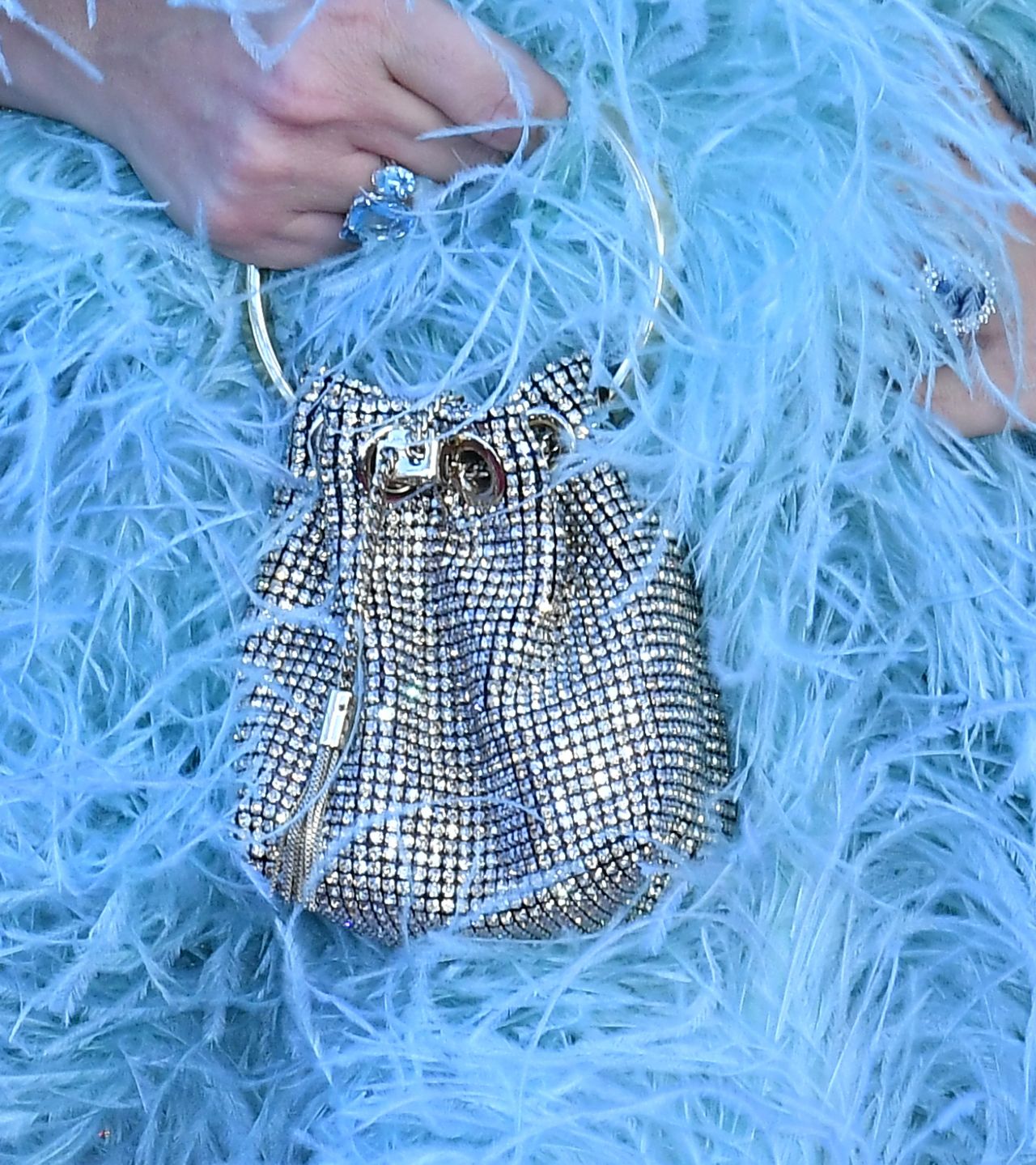 Camila donned a stunning sequined dress featuring a captivating blend of silver and blue hues. The vertical stripes and fan-like pattern of the sequins created a mesmerizing effect, catching the light with every move. But the real showstopper? The dress was adorned with a cloud of baby blue feathers that added a touch of whimsical elegance to the look.
