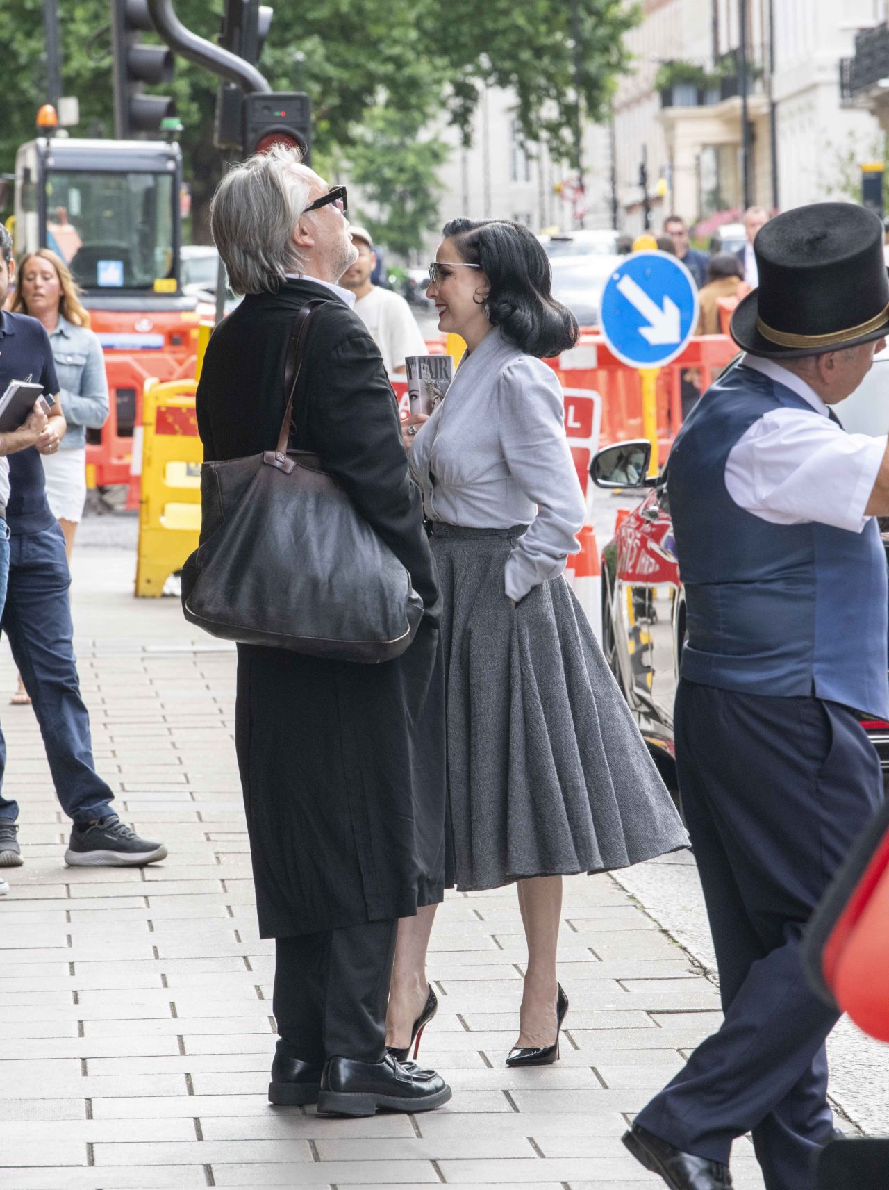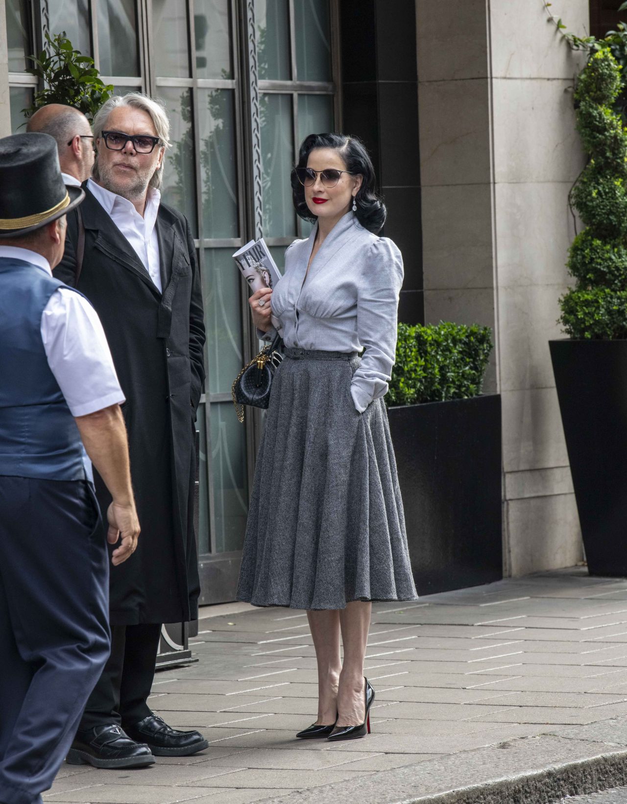 Dita Von Teese, the queen of burlesque, continues to captivate with her timeless style. Spotted in London, she exuded sophistication in a grey ensemble that perfectly blended vintage charm with modern flair.