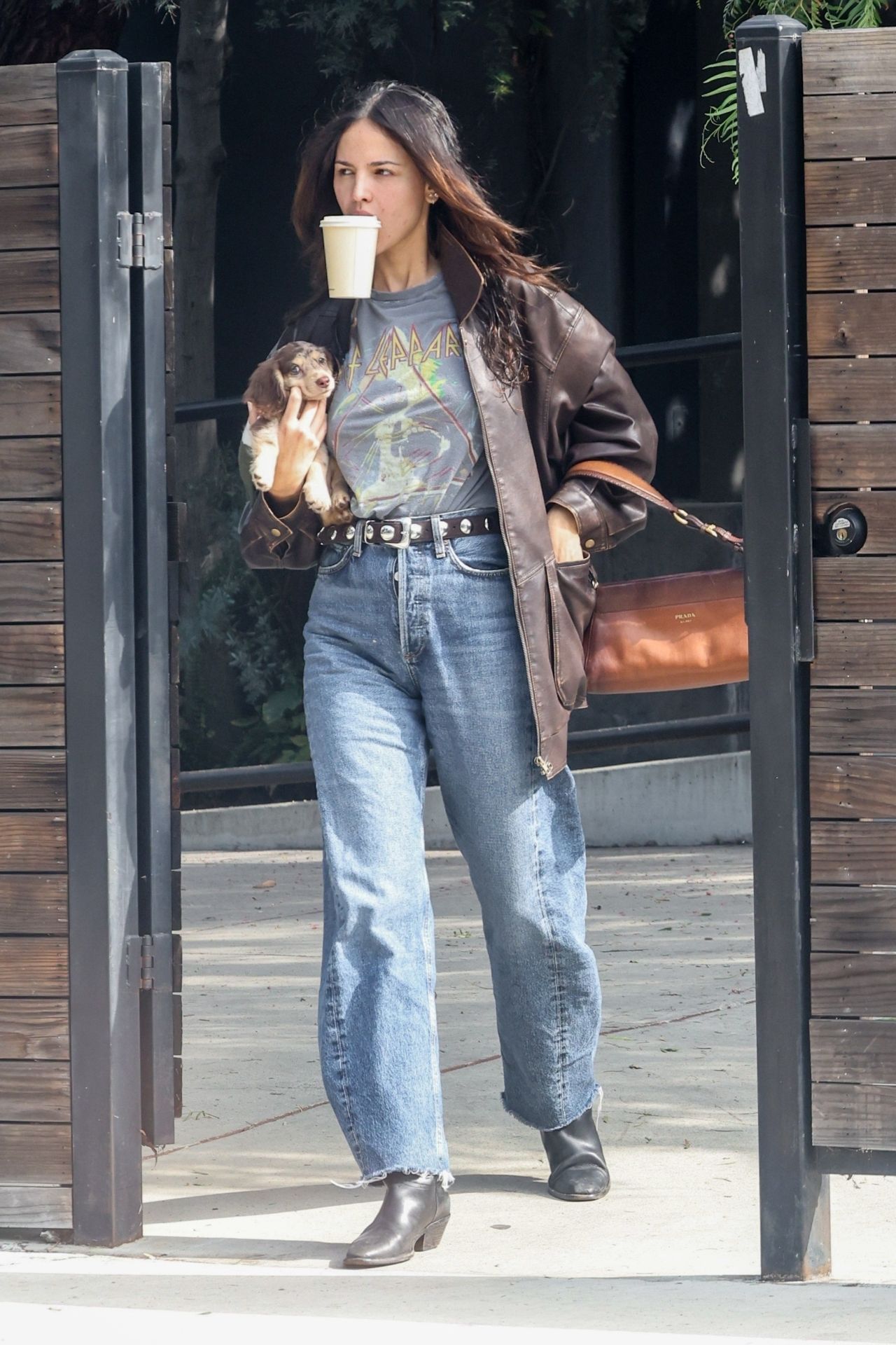 Spotted! The ever-stylish Eiza Gonzalez was seen strutting her stuff in Los Angeles, serving up a dose of rock ‘n’ roll chic with a side of adorable. The actress rocked a vintage-inspired Def Leppard tee, paired with high-waisted, wide-leg jeans and a brown leather jacket.