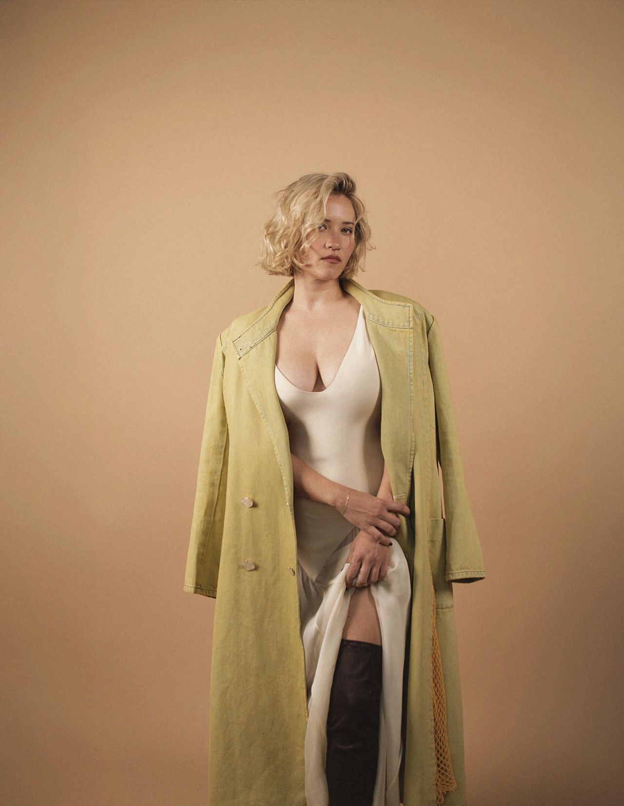Emily Osment, the actress we all grew up with on Disney’s “Hannah Montana,” is proving she’s all grown up and embracing a new, sophisticated style. In a recent photoshoot, Osment stuns in a creamy white dress, daringly paired with thigh-high boots and a vintage-inspired, chartreuse trench coat.