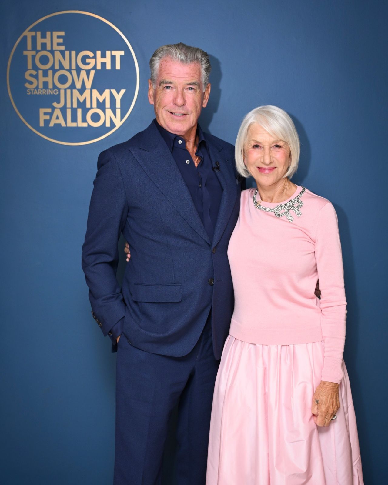 Brosnan, looking sharp in a navy suit, complemented Mirren’s radiant energy perfectly. The duo posed effortlessly against the iconic Tonight Show backdrop, proving that their star power is as potent as ever.