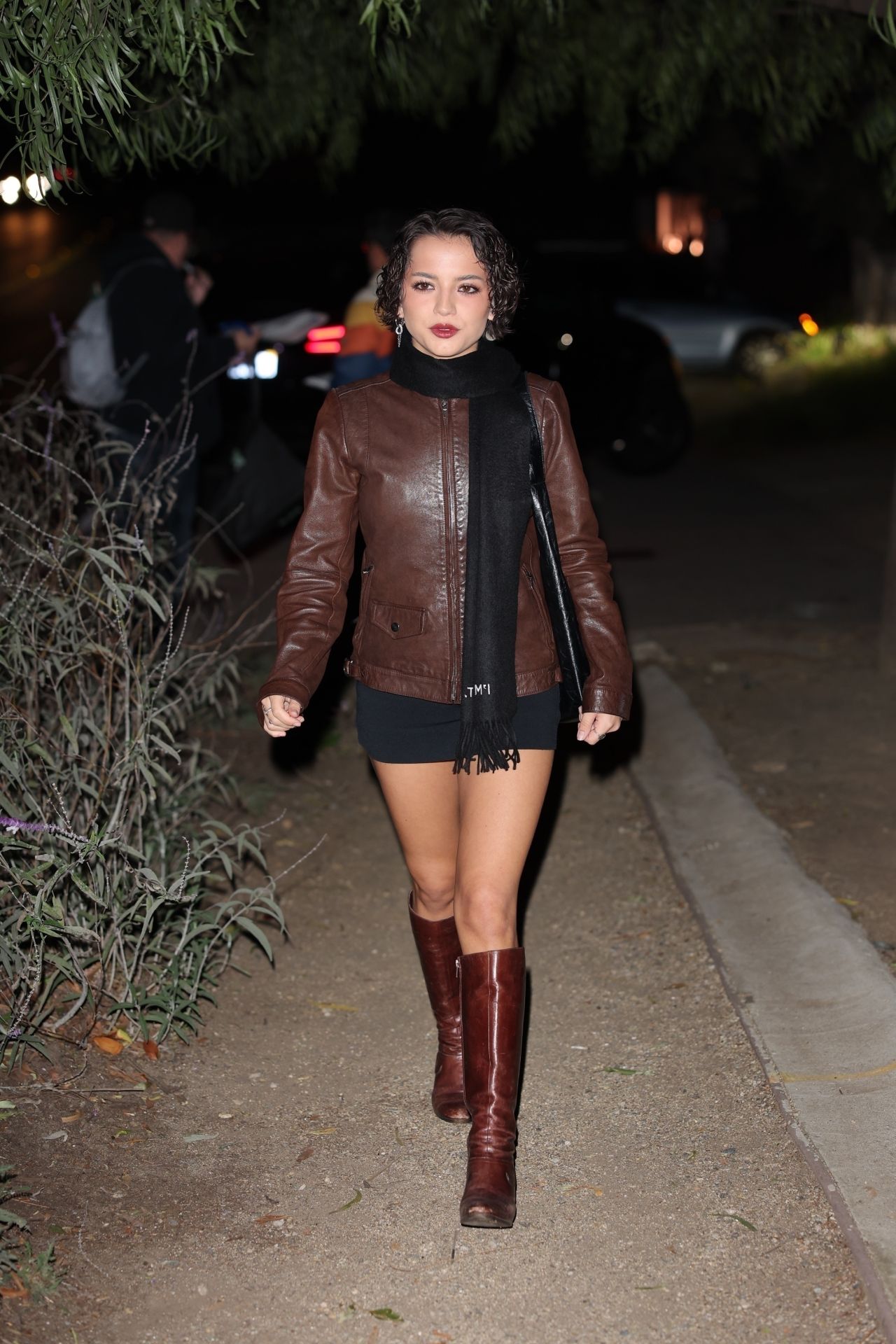 Isabela rocked a sleek black mini-skirt paired with knee-high, glossy brown leather boots that screamed confidence. To combat the evening chill, she donned a classic brown leather jacket and a long, fringed black scarf. The look was completed with subtle yet glamorous makeup, highlighting her natural beauty.