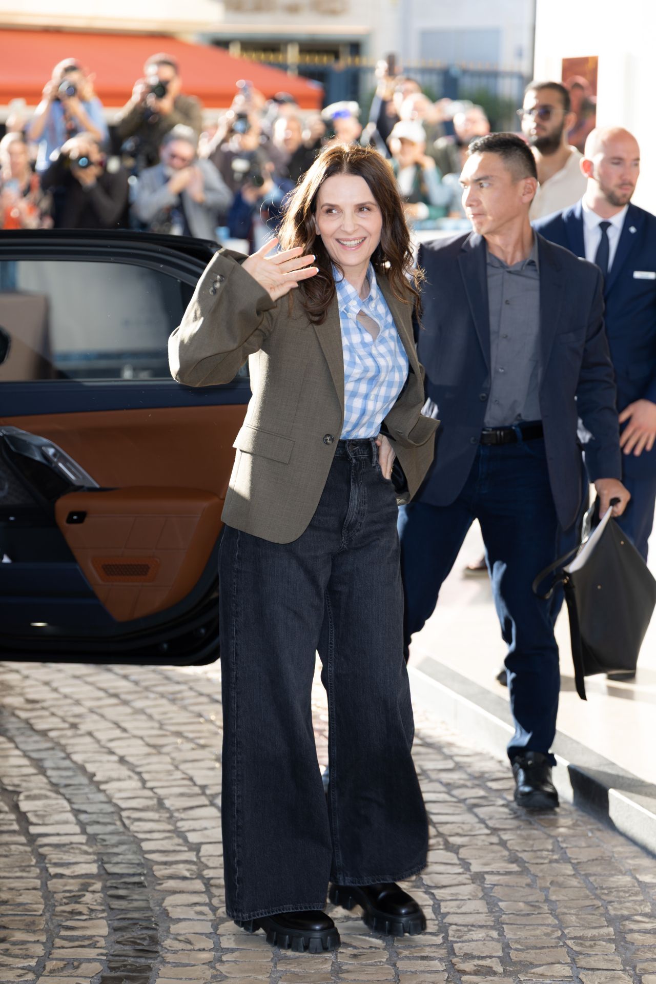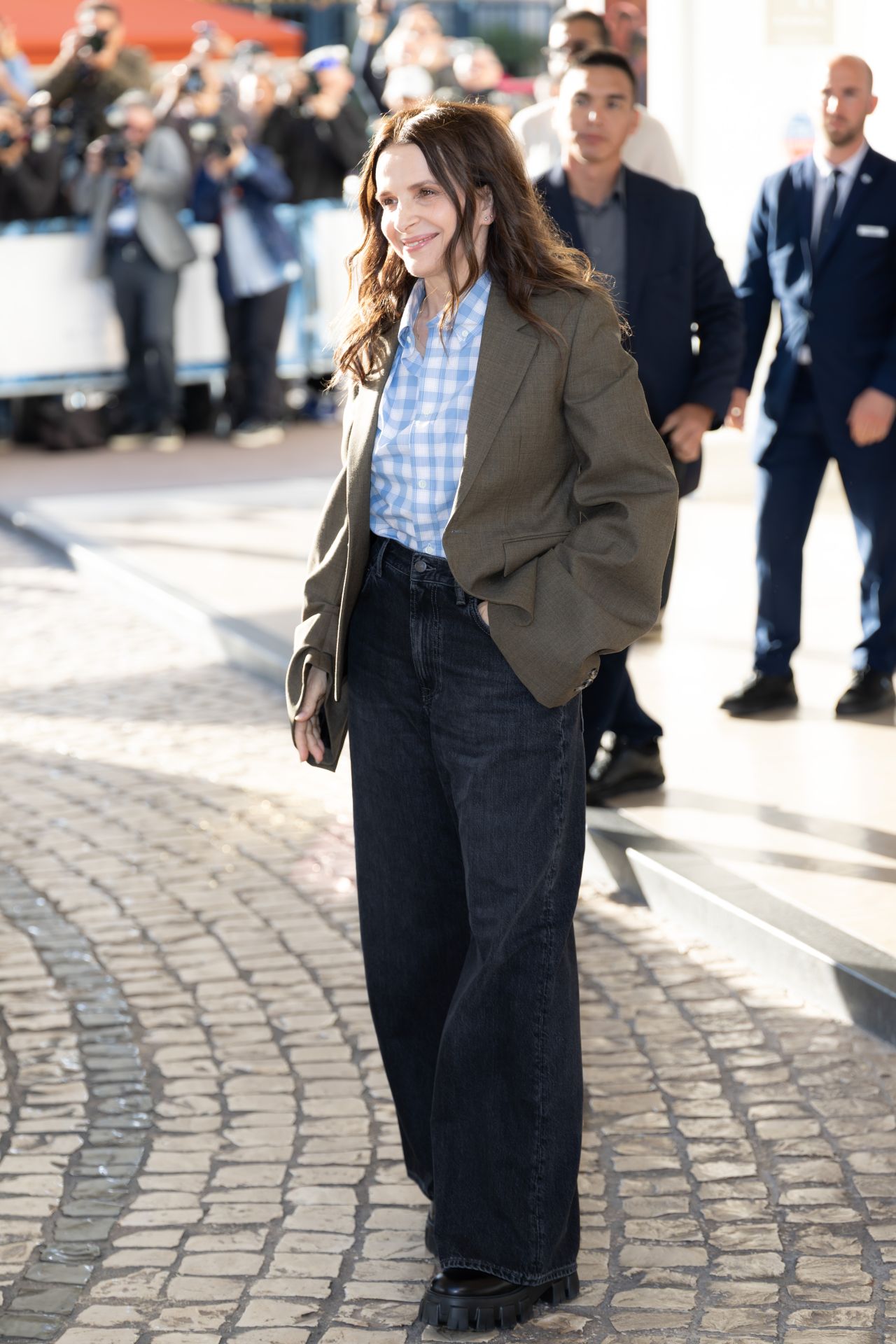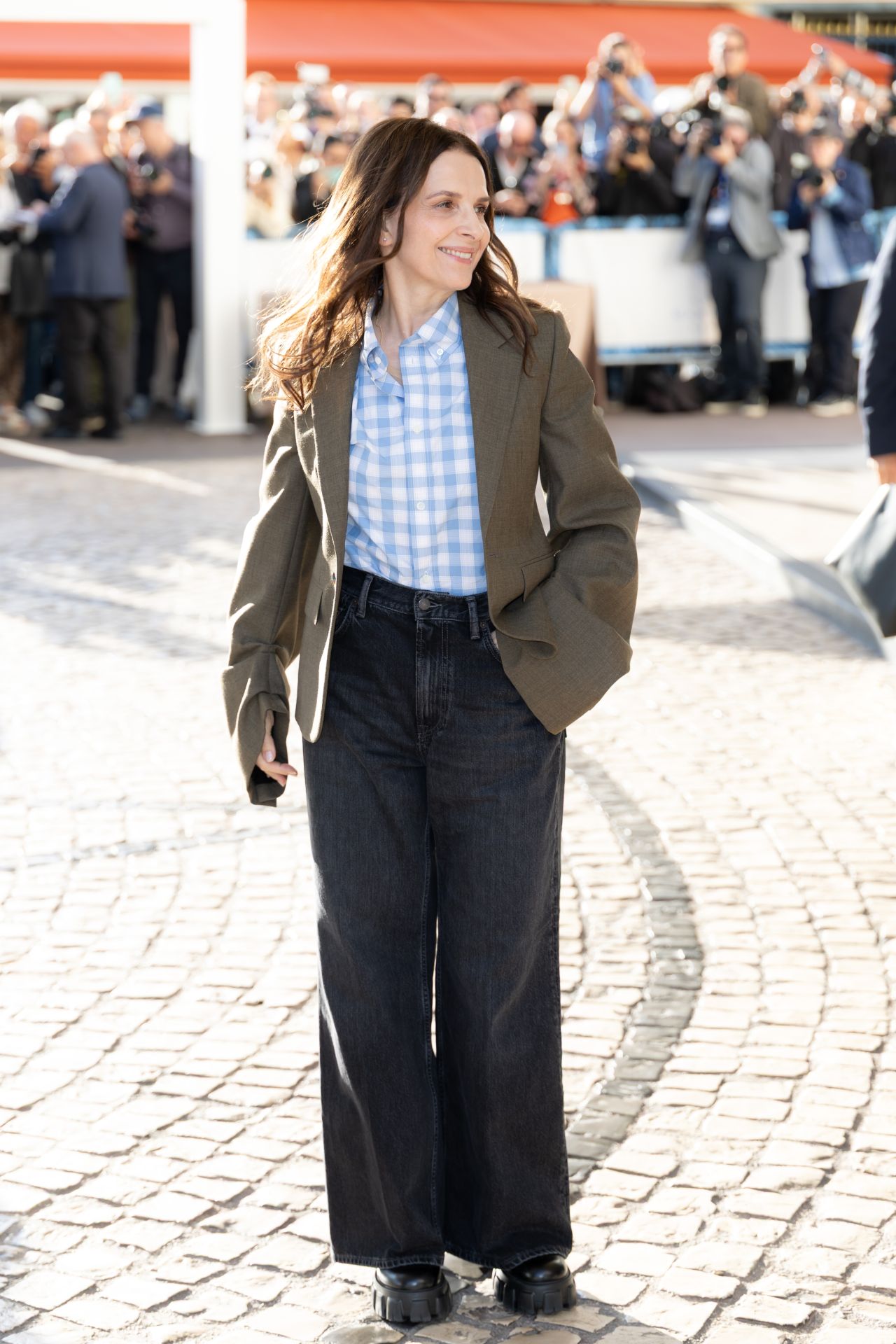 Binoche opted for a classic blue and white checkered shirt, paired with a subtly oversized olive-green blazer. The look was grounded by wide-leg, dark-wash denim jeans and chunky black platform shoes, adding a touch of modern edge to her overall appearance. Her hair, styled in loose waves, framed her radiant smile as she navigated the cobblestone streets amidst a throng of photographers and fans.