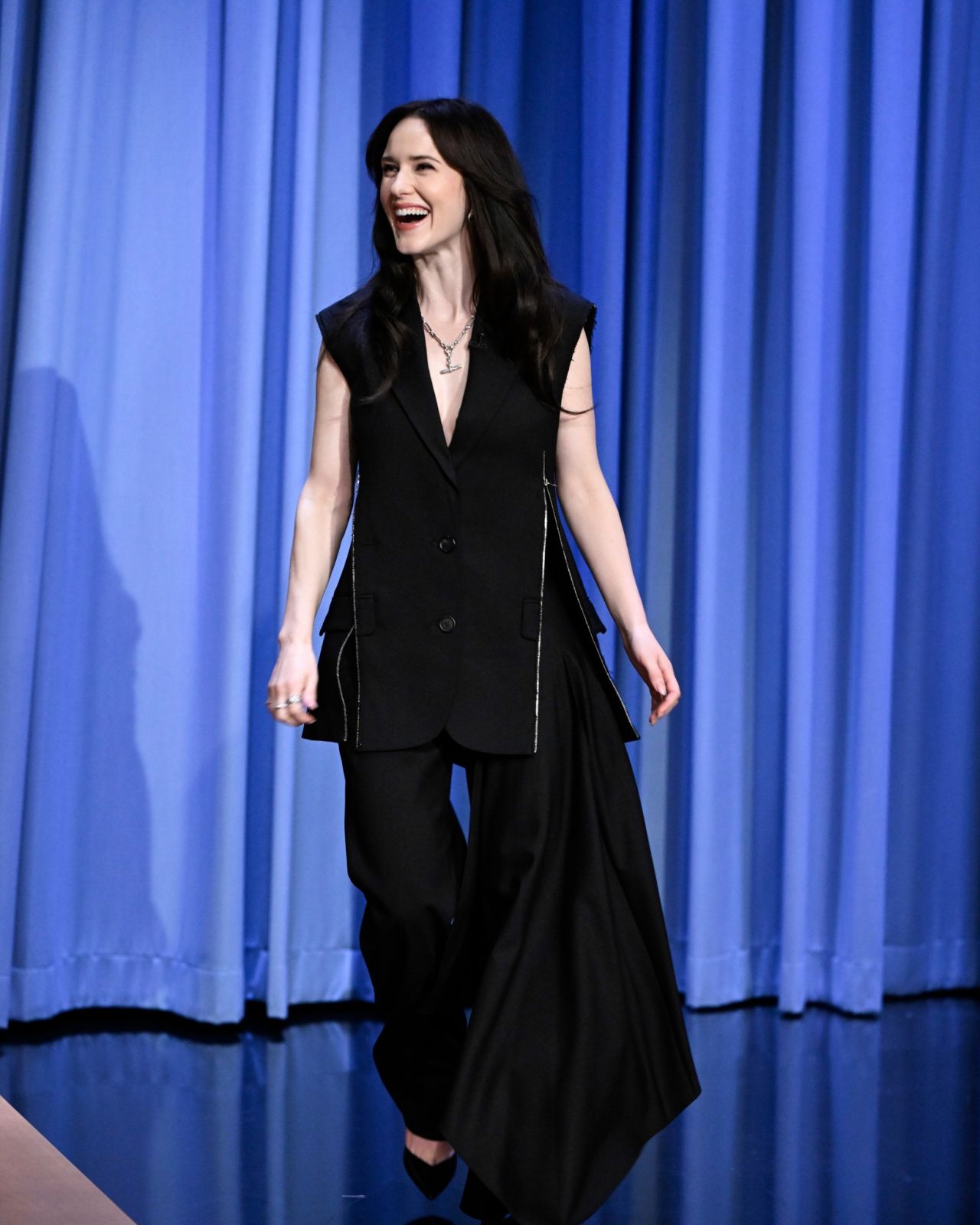 Rachel Brosnahan, the darling of “The Marvelous Mrs. Maisel,” traded in her vintage frocks for a decidedly modern and edgy ensemble on “The Tonight Show.” The actress, known for her impeccable style, surprised fans with a sleek, sleeveless black blazer paired with wide-leg trousers.