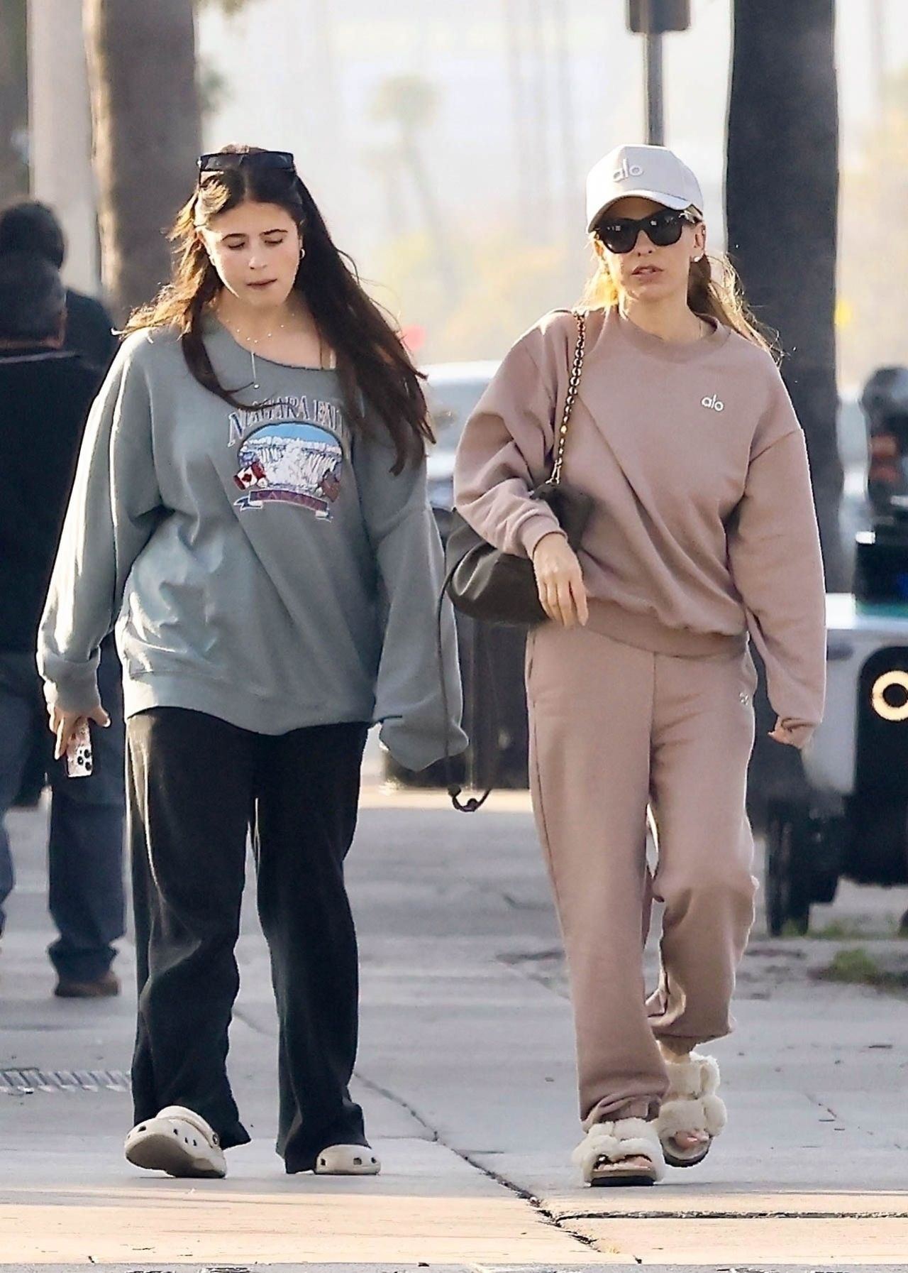 Walking alongside her was a young woman in a casual gray sweatshirt featuring a “Niagara Falls” graphic, paired with black pants and Crocs. The duo seemed relaxed and at ease as they enjoyed their time together in the California sunshine.