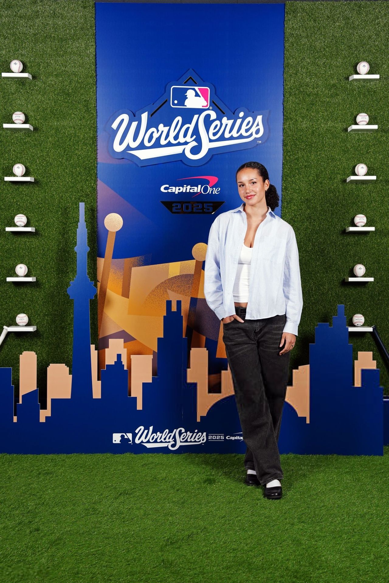 The backdrop, featuring the World Series logo, Capital One branding, and a stylized cityscape, added a playful touch to the scene. With baseballs displayed on shelves and artificial turf underfoot, the setting perfectly captured the spirit of the game.