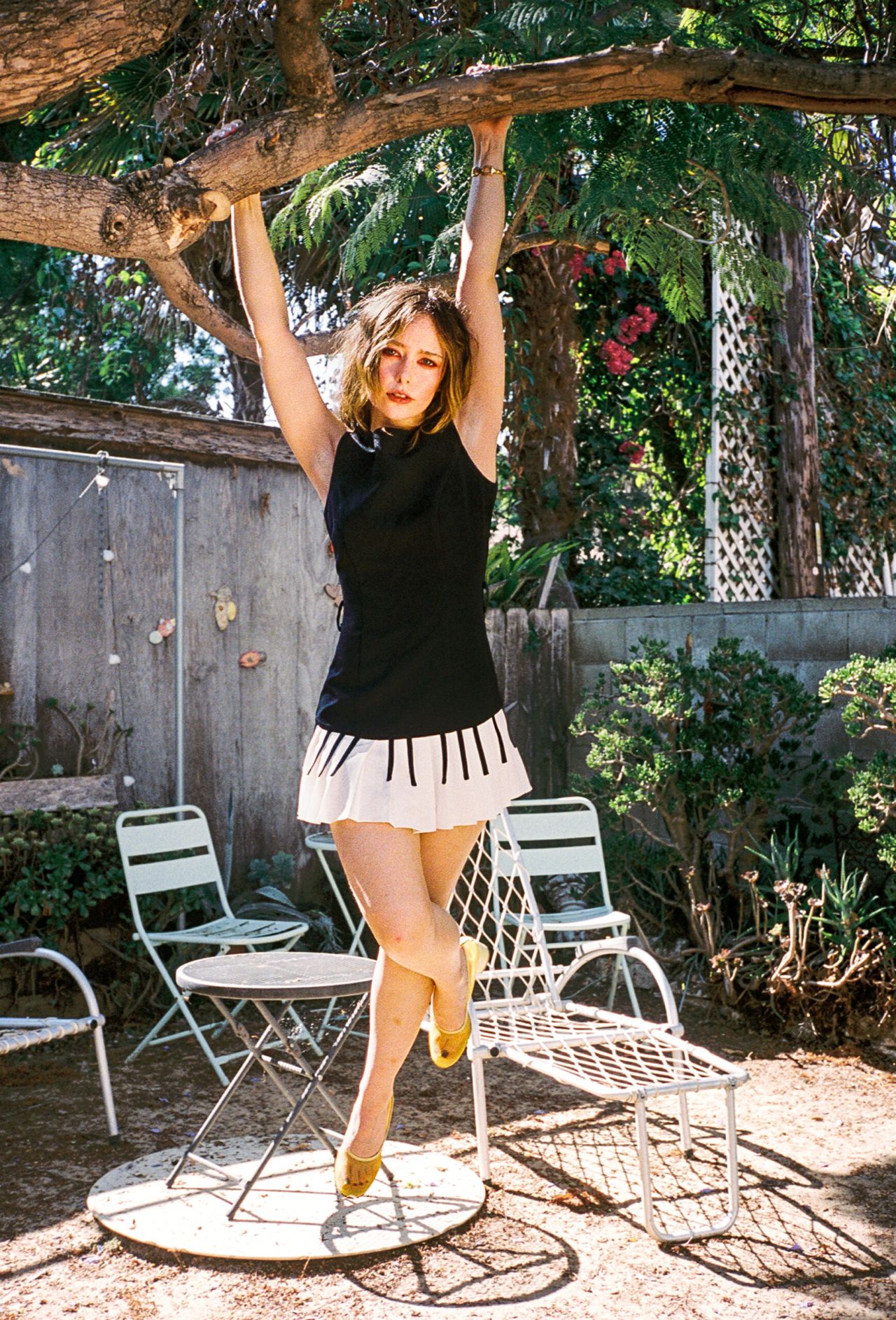 Is this a glimpse into Suzanna Son’s off-duty style? Or a hint at a new role where she plays a musical prodigy with a penchant for arboreal acrobatics? Only time will tell. But one thing’s for sure: Suzanna Son continues to redefine what it means to be a style icon, one gravity-defying pose at a time!