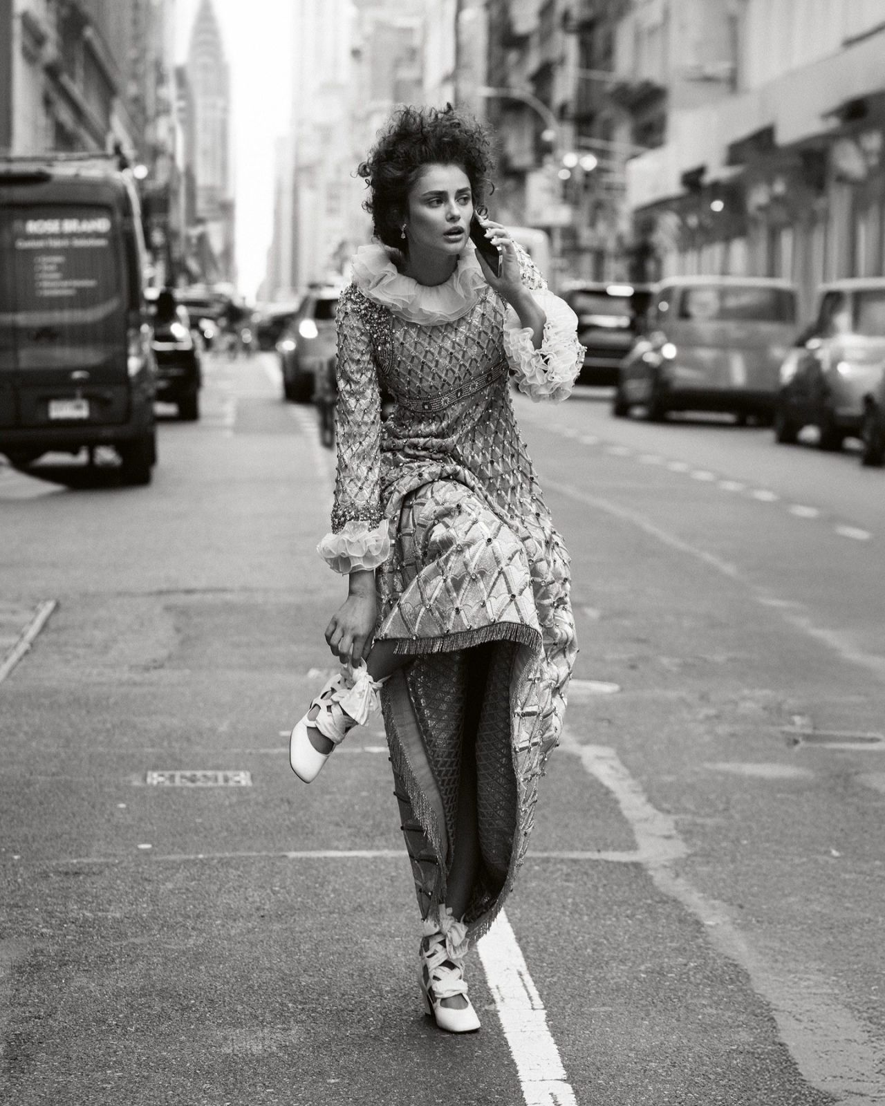 Her hair is styled in loose, tousled waves, adding to the effortless yet sophisticated vibe. And that gaze? Piercing, confident, and utterly mesmerizing. Taylor Hill is not just wearing the clothes; she’s embodying a powerful narrative.